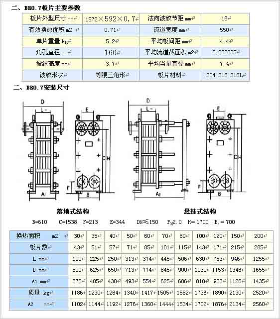 | BR0.7型板式换热器产品简介:我厂生产的BR0.7型板式换热器,具有换热效率高,物料流阻损失小,结构紧凑,温度控制灵敏,操作弹性大,装拆清洗方便,使用寿命长等特点,是目前国内最先进的高效换热器。 我厂生产的BR0.7型板式换热器产品,可处理的物料非常广泛,从普通的工业用水,到高粘度的液体,从卫生要求较高的食品液体、医药物料到具有一定腐蚀性的酸碱液体,从含小颗粒粉体液体物料到含少量纤维的悬浮液体均可采用板式换热器处理。 BR0.7型板式换热器应用广泛,可用于加热、冷却、蒸发、冷凝、杀菌消毒、热力回收等场合。如冷却发电机组和整流器内循环水;冶金矿山等机械润滑油;液压站、稀油站的液压油;机械制造中的淬火油、电镀溶液等;用于食品酿造行业中麦芽汁、蛋液、食用油的杀菌消毒,啤酒、葡萄酒的杀菌处理;用于轻纺工业、造纸行业中的余热回收;收集冷凝水,集中供热;汽改水暖;锅炉除氧系统中的中间加热等,板式换热器都是最联想的换热设备。目前已广泛用于冶金、矿山、石油、化工、电力、医药、食品、化纤、轻纺、造纸、船舶和集中供热等工业部门。 BR0.7型板式换热器结构原理: BR0.7型板式换热器订货须知: