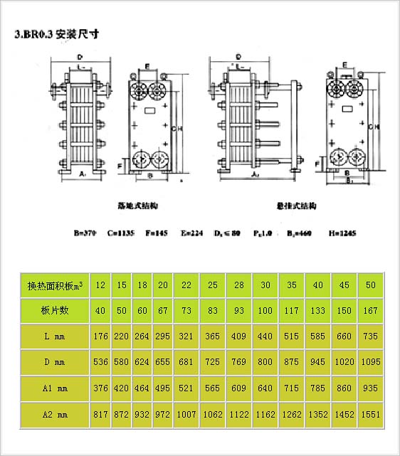 | BR0.3型板式换热器是一种新型节能的换热设备。BR0.3型板式换热器主要由不锈钢压制的传热片、密封胶垫、夹紧螺栓和压紧板整机框架等零部件组成。具有换热效率高,物料流阻损失小,结构紧凑,温度控制灵敏,操作弹性大,拆装方便,使用寿命长等特点,是目前国内最先进的高效节能换热设备。 BR0.3型板式换热器可耐各种腐蚀介质,传热效率高,冷热介质通过相邻板片流经各自通道进行换热。由于板片上有人字形波纹,介质流动形成湍流, 因此获得较高的换热效率。高效节能,传热系数高。其换热系数可达3000-4500kcal/m2.゜C.h.是相同流速下管壳式换热器的3倍以上。使用安全可靠,结构紧凑,体积小,占地少,是同等换热面积管壳式换热器的五分之一左右。 BR0.3型板式换热器组合灵活,调整维修方便,松开压紧螺母即可进行清洗维护(可参考板式换热器设备清洗要点),更换胶垫或板片。板式换热器板片均为独立元件,可按用户要求随意增减换热面积和流程。密封槽设置泄液液道,各种介质不会串通,即使出现泄漏,也是向外排出。 BR0.3型板式换热器各个部件的功能: BR0.3型板式换热器订货须知: